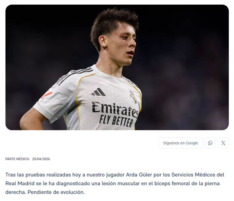 Real Madrid Sağlık Ekibi tarafından bugün oyuncumuz Arda Güler'e yapılan muayeneler sonucunda, sağ bacağındaki femoral biseps kasında bir kas yaralanması olduğu tespit edildi. Durumu takip ediliyor.