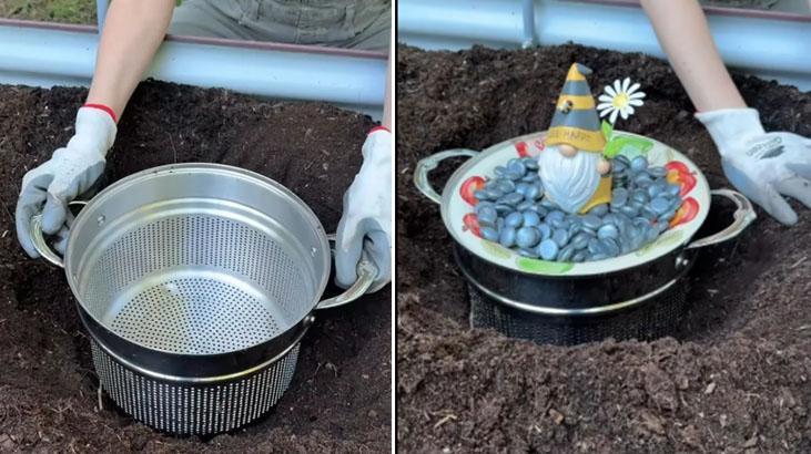 Sistemin mantığı oldukça basit. Bahçenizde ya da büyük bir saksıda küçük bir çukur açıyorsunuz. Ardından süzgeç ya da delikli bir kap bu çukura yerleştiriliyor. Bu kap tamamen toprağın altında kalacak şekilde konumlandırılıyor. Üzeri ise bir tabak ya da düz bir kapakla kapatılıyor. Alison, kapak olarak bir tabak kullandığını ve üzerine ağırlık koyarak sabitlediğini söyledi.