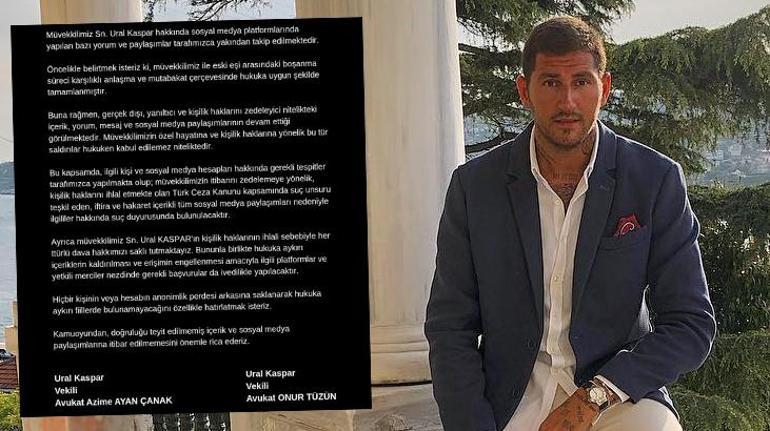 ''Müvekkilimiz Sn. Ural Kaspar hakkında sosyal medya platformlarında yapılan bazı yorum ve paylaşımlar tarafımızca yakından takip edilmektedir. Öncelikle belirtmek isteriz ki, müvekkilimiz ile eski eşi arasındaki boşanma süreci karşılıklı anlaşma ve mutabakat çerçevesinde hukuka uygun şekilde tamamlanmıştır. Buna rağmen, gerçek dışı, yanıltıcı ve kişilik haklarını zedeleyici nitelikteki içerik, yorum, mesaj ve sosyal medya paylaşımlarının devam ettiği görülmektedir. Müvekkilimizin özel hayatına ve kişilik haklarına yönelik bu tür saldırılar hukuken kabul edilemez niteliktedir. Bu kapsamda, ilgili kişi ve sosyal medya hesapları hakkında gerekli tespitler tarafımızca yapılmakta olup; müvekkilimizin itibarını zedelemeye yönelik, kişilik haklarını ihlal etmekte olan Türk Ceza Kanunu kapsamında suç unsuru teşkil eden, iftira ve hakaret içerikli tüm sosyal medya paylaşımları nedeniyle ilgililer hakkında suç duyurusunda bulunulacaktır. Ayrıca müvekkilimiz Sn. Ural KASPAR'ın kişilik haklarının ihlali sebebiyle her türlü dava hakkımızı saklı tutmaktayız. Bununla birlikte hukuka aykırı içeriklerin kaldırılması ve erişimin engellenmesi amacıyla ilgili platformlar ve yetkili merciler nezdinde gerekli başvurular da ivedilikle yapılacaktır. Hiçbir kişinin veya hesabın anonimlik perdesi arkasına saklanarak hukuka aykırı fiillerde bulunamayacağını özellikle hatırlatmak isteriz. Kamuoyundan, doğruluğu teyit edilmemiş içerik ve sosyal medya paylaşımlarına itibar edilmemesini önemle rica ederiz''