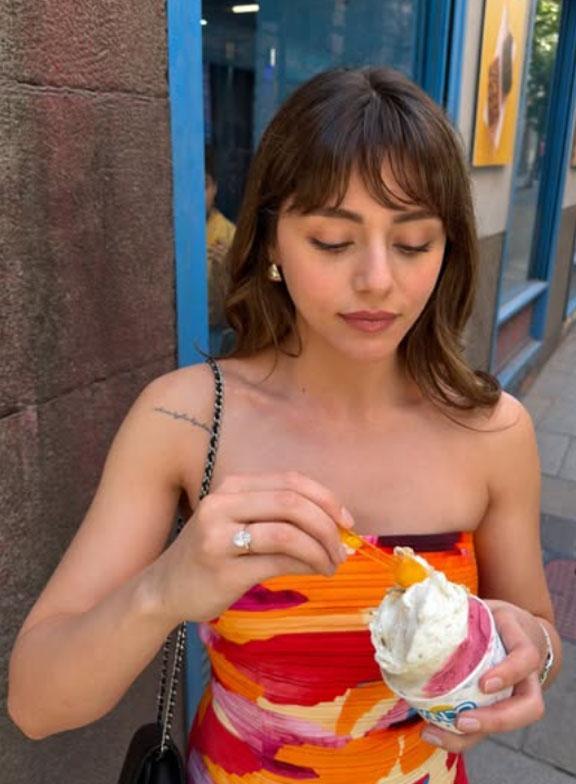 Sevgilisi Ata Ayyıldız'dan aldığı evlilik teklifinin nişanesi olan o dev taş, İspanya güneşinin altında adeta parladı.