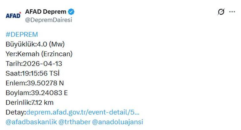 Erzincan'ın Kemah ilçesinde saat 19.15'te 4 büyüklüğünde deprem meydana geldi.