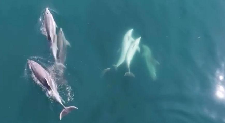Suyun içinde adeta dans ederek yüzen yunuslar, çevredekiler tarafından cep telefonu ile kaydedildi.